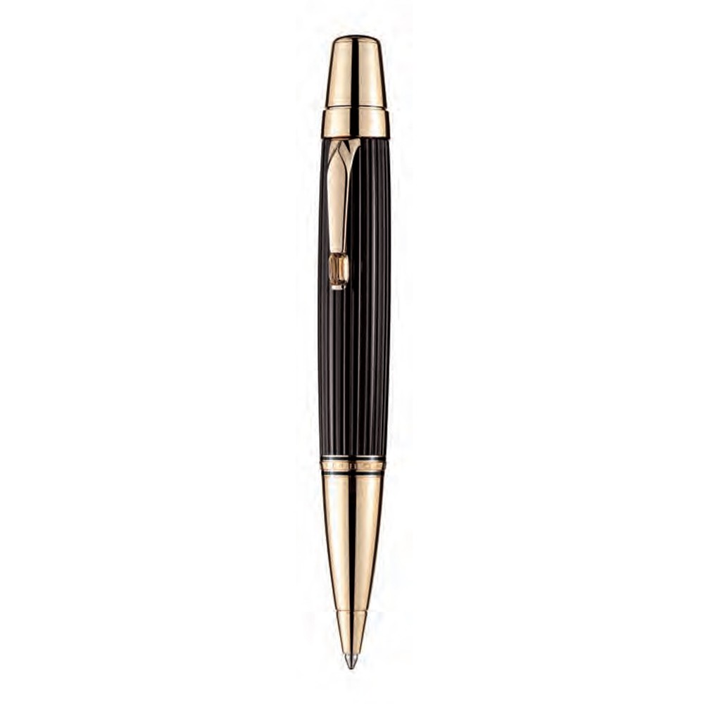 | Barrel | Brown-black precious resin, champagne-tone gold-plated forepart, cone and fittings, inlaid with Montblanc emblem. |