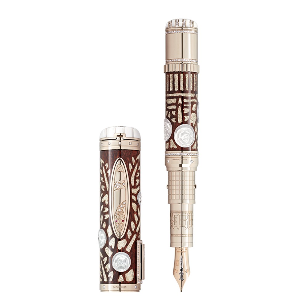 The name ‘Orient Express’ conjures magic and myth from a time when sophisticated travelers heeded the siren’s call of exotic lands. It awakens visions of a glamorous train designed for lavish living. It unites a longing for adventure, for distant and mysterious lands, with total immersion in a world of lavish luxury. It all began with Georges Nagelmackers, a visionary who dreamed of traveling comfortably and unimpeded overland from Paris to Constantinople. His dream finally became reality on October 4, 1883. On that day, an elegant crowd thronged the Gare de l’Est in Paris to celebrate with great fanfare the maiden run of one of the most luxurious trains ever created. The myth of the Orient Express had begun. This icon of stylish rail travel is the inspiration for the Montblanc High Artistry A Journey on the Orient Express Limited Edition 10. Its overall design is an homage both to the interior decoration crafted by René Lalique and to Agatha Christie’s novel Murder on the Orient Express. A passionate globetrotter, Agatha Christie was one of the most famous writers who both traveled on and wrote about the Orient Express, immortalizing the train in her 1934 crime novel Murder on the Orient Express, featuring a cast of inscrutable characters and almost indecipherable clues. The design of this edition makes many references to the details of the fictional case. The cap and barrel are crafted from stained sycamore wood, decorated with handcrafted gold-leaf and crystal flower inlays modeled on the train’s luxurious interiors, including the wood marquetry of René Prou and the molded glass and silver inlays by René Lalique. A special push opening mechanism is opulently adorned with brilliant-cut diamonds. The cap top in white chalcedony is inlaid with a Montblanc emblem in solid Au 750 gold outlined with a profusion of brilliant-cut diamonds. The stone can be opened to reveal a “broken” miniature clock with a white enamel dial, hidden inside with the time frozen at 01:15, the time of the murder. The cap top ring is set with 12 stones, evoking the number of times the victim was stabbed, while the solid Au 750 bi-color gold nib is embossed with the murder weapon, a dagger. The forepart is engraved with the floorplan of cabin 2, where the murder occurred. The number “2” also appears on the solid gold cone, decorated with brilliant-cut diamonds and inlays made from white chalcedony, with a screwing gear mechanism for piston filling. The iconic oval window in the dining car is the inspiration behind the “hidden” clip, recessed into the cap, in solid Au 750 gold embellished with a hand-engraved serpent body and head partly set with brilliant-cut diamonds and two rubies as eyes. The serpent is a reference to the Montblanc Writers Edition 1993 honoring Agatha Christie that featured a clip adorned with a serpent. With signature gold and/or signature gold-coating, Montblanc evokes the enlightened shade of yellow gold which has become an appreciated tone for the Maison’s writing instruments.