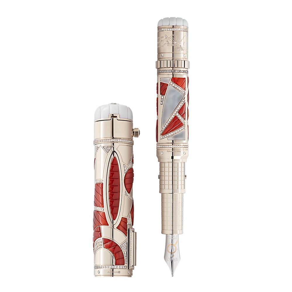 The name ‘Orient Express’ conjures magic and myth of a time when experienced travelers followed the call of exotic lands. It awakens visions of a glamorous train designed for lavish living. It unites a longing for adventure, for distant and mysterious lands, with total immersion in a world of lavish luxury. It all began with Georges Nagelmackers, a visionary who dreamed of traveling comfortably and unimpeded overland from Paris to Constantinople. His dream finally became reality on October 4, 1883. On that day, an elegant crowd thronged the Gare de l’Est in Paris to celebrate with great fanfare the maiden run of one of the most luxurious train ever created. The myth of the Orient Express had begun. The Montblanc High Artistry Orient Express Limited Edition 5 expresses the elegant style of the early 20th century with an abstract pattern made of solid Au 750 signature gold and hand-carved red chalcedony stone, reflecting the upholstery pattern created exclusively for the Orient Express furniture. The modernist look of this edition reflects the height of fashion and design at a time when the Orient Express provided a novel setting in which the rich and famous could play. The illustrious guests included royalty and film stars, as well as famous personalities such as the charismatic Mata Hari, who had a remarkable talent for combining pleasure with intrigue. In a tribute to Mata Hari, one of the more mysterious passengers who frequented the Orient Express, a window in the barrel opens to reveal a delicate miniature painting of this famous dancer. Due to its tiny dimensions, this hand painting represents highly precise artistry carried out on a level beyond what’s visible to the naked eye. The theme of espionage running through the story of Mata Hari is captured on the handcrafted, solid Au 750 gold nib in an engraving of a magnifying glass and fingerprint. Within its striking composition of gold, diamonds and red chalcedony, the cap conceals a special snap opening mechanism and a solid Au 750 signature gold clip, also set with red chalcedony. The opening mechanism activated by pressing a button on the side is a tribute to the elegant machinery of the steam engine. The traditional routes of the Orient Express from 1930 are engraved on the solid Au 750 signature gold cone, surrounded with diamonds and crowned by white chalcedony. In reference to the importance of timekeeping on this legendary journey, the cap top opens to reveal a miniature automaton watch with a mechanical movement and a beautifully designed enamel dial. The rounded shape of the cap top, made of white chalcedony stone, recalls the domed, ivory-colored tops of the Orient Express cars. In a fitting tribute to the train that made luxury its mission, this edition is crowned with a Montblanc diamond. With signature gold and/or signature gold-coating, Montblanc evokes the enlightened shade of yellow gold which has become an appreciated tone for the Maison’s writing instruments.