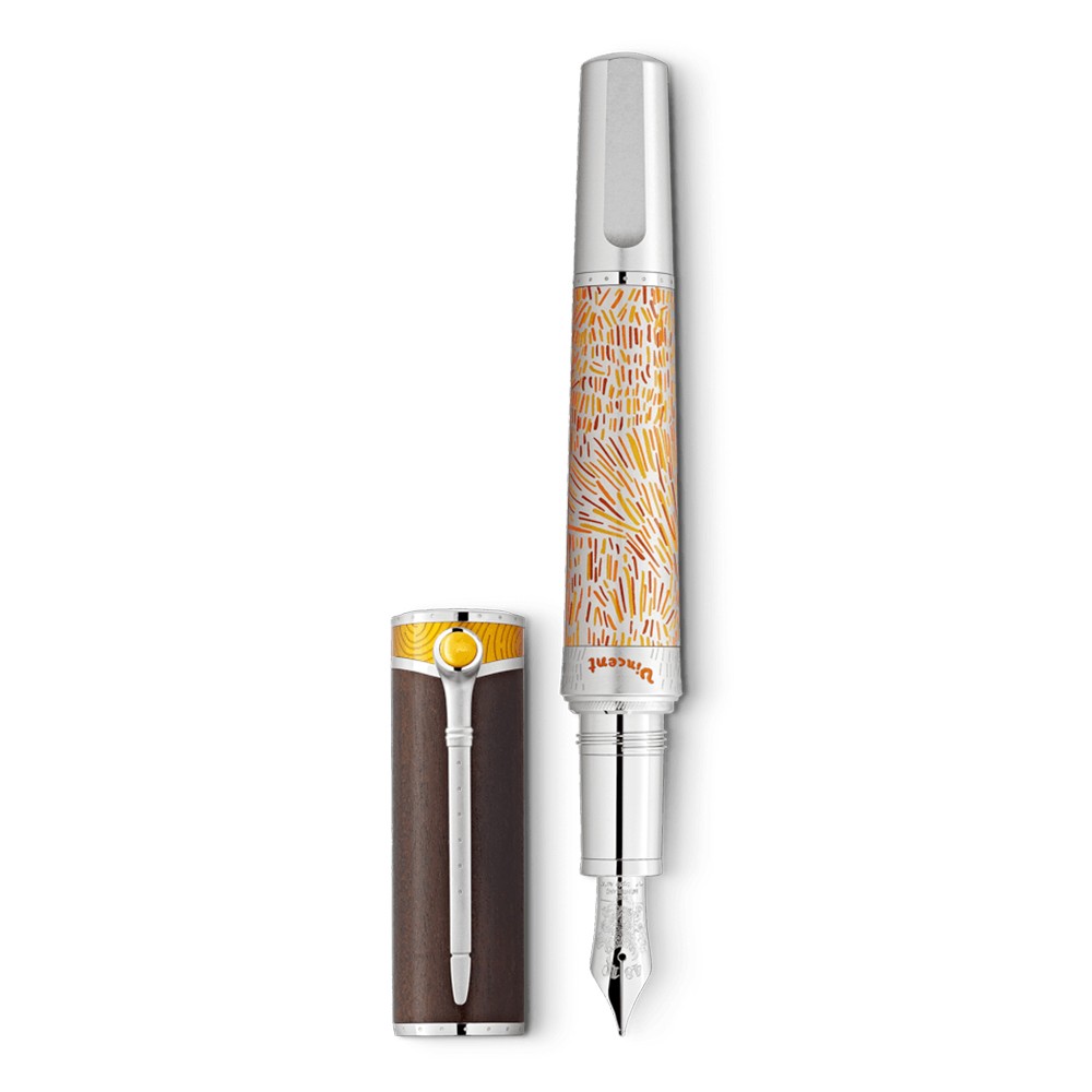 With the Montblanc Masters of Art Homage to Vincent van Gogh Limited Edition 4810, Montblanc celebrates Vincent van Gogh, one of the most popular painters of the late 19th century. This edition especially emphasizes his time in Arles with design details reflecting the Provencal wheatfields and one of his most famous paintings, “Sunflowers”. The engraved 1888 on the barrel ring - next to Vincent's signature in bright orange - commemorates the year when he moved to Arles. While the barrel is decorated in shades of yellow and orange reflecting the sun-drenched landscapes of southern France, the famous series of five sunflower paintings inspired the interpretation embossed on the handcrafted Au 750 solid gold, rhodium-coated nib. Van Gogh developed a looser, freer style and becoming equally competent with brush and palette knife – which he used for chunky, impetuous “impasto” work. His palette knife inspired the platinum-coated clip, while his sweeping brushwork is immortalized in the yellow lacquer of the cap top. Furthermore, his fondness for pipe smoking, to which he referred in many of his self-portraits, is captured in a subtle detail of the clip: the upper part is shaped like a pipe’s bowl and filled with yellow precious resin. As homage for Vincent's fascination of traditional Japanese woodblock prints, the overall shape is inspired by a Japanese woodcutting knife while the cap is made from wood. The edition is crowned by a Montblanc emblem made of yellow precious resin.