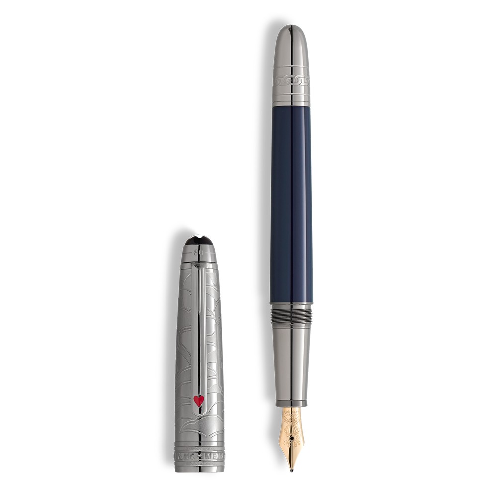 The Meisterstück Around the World in 80 Days collection draws its inspiration from Jules Verne's renowned adventure novel. The Solitaire Doué Classique Fountain Pen, adorned in polished dark blue precious lacquer with a metal cap, recounts the epic journey of Mr. Fogg and Passepartout. Embarking on the final leg from Yokohama back to London via the United States, the duo traverses the vast American continent by train. Delve into the intricate details – a train elegantly lasered on the cap, a safety chain pattern on the cone, mirroring a pivotal moment when Passepartout detaches the train from the locomotive to save the crew who was attacked by Sioux. The cap's design captures pressure valves and the billowing smoke of the locomotive, while the clip boasts a red lacquered heart card suit, symbolizing the union between Phileas Fogg and Princess Aouda. Additionally, card suits represent Fogg's daring wager to complete the journey in a mere 80 days. The cap top bears the embossed timeline of the journey – 36 days from Yokohama to London, culminating in the grand total of 80 days around the world. Elevating this writing instrument is a hand-crafted 18K gold nib marked with 14/11 and 21/12 – a reminder of Mr. Fogg's departure from Yokohama on November 14 and his ambitious plan to return to the London club by December 21 to win the wager. It is also adorned with a depiction of a hot air balloon, reference to Jules Verne's first adventure novel.