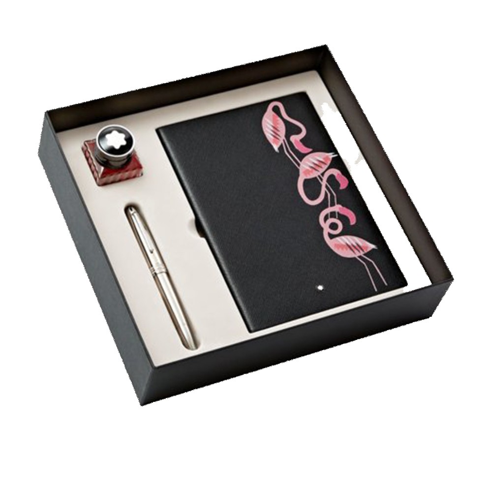 The Webster Special collection is a capsule celebrating Montblanc writing culture heritage with The Webster pink signature color with the flamingo emblem. The Solitaire Fountain Pen features a platinum coated cap and barrel, as well as a bold pink lacquer forepart. The Webster signature pink flamingo is etched on the 18K rhodium coated gold nib. The Montblanc emblem crowns the writing instrument in black and white. To enhance the writing experience, a special pink ink in The Webster’s official Pantone color has been created. The notebook is made of calfskin leather with a digital print of The Webster's Flamingo on the cover.