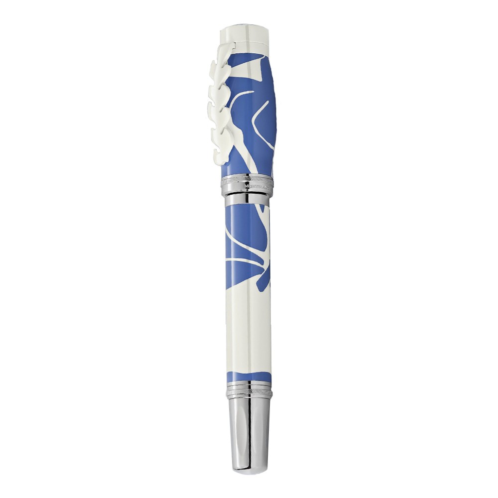 Inspired by one of Matisse’s most famous artworks, the female Blue Nude III, the edition brings the motif to life in luminous blue and white lacquer on cap and barrel. The generously rounded, almost sculptural shape of the cap is a nod to the pronounced curves of many Matisse sculptures. The pattern on the platinum-coated cone borrows the elliptical shapes resembling flower petals. Blue precious resin surrounds the Montblanc emblem made of white precious resin on the cap top. The organic shape of the clip which features a white lacquer coating, is an homage to Matisse’s large-scale painting The Sheaf. The handcrafted, rhodium-coated solid Au 750 gold nib is embossed with two botanical elements reminiscent of The Sheaf and the interwoven letters ‘H’ and ‘M’.