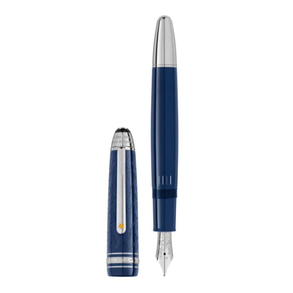 The Meisterstuck Le Petit Prince LeGrand Fountain Pen in deep blue precious resin is inspired by the dark blue universe sky. The cap, milled with a fox face pattern, reveals a sentence from the Le Petit Prince book and is crowned with the iconic emblem. The central ring of the three platinum-coated rings features the Montblanc brand name and the clip is embellished with a yellow lacquered star. The writing instrument is finished with a handcrafted Au585 / 14 K bi-colour nib garnished with the Petit Prince and the fox.