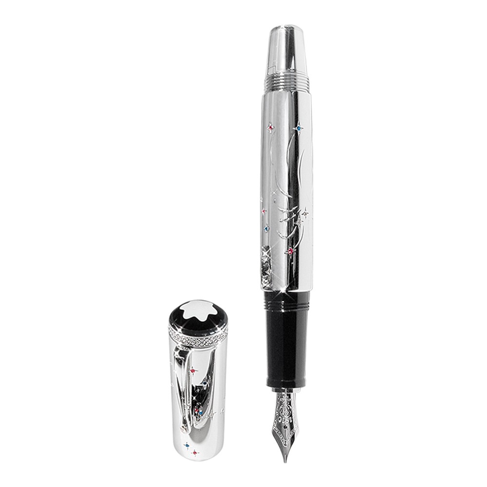 | Overall Design | The Au750 solid white gold fountain pen is decorated with a hand engraved firework design in the American colors. 18 sapphires, 98 diamonds and 18 rubies create a sparkling effect on barrel and cap. |
