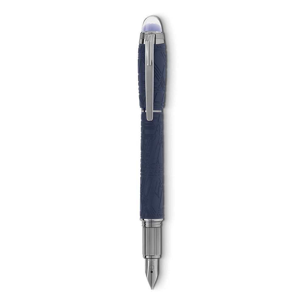 Starwalker SpaceBlue looks beyond planet earth and turns towards the stars and the galaxy. Utterly masculine and futuristic, this new StarWalker collection brings a new look for resin cap and barrel, with a design that recalls the intricate structures of the Widmanstätten Pattern, one of nature's most hypnotic creations. All metal parts are coated in dark ruthenium, accompanied by a deep space blue tone for the matte precious resin, recalling the hues of a starry sky. Also the subdome on the cap top, over which the Montblanc emblem floats, comes in a deep space blue colour. The fountain pen is hand-crafted with a rhutenium-coated Au585 gold nib.