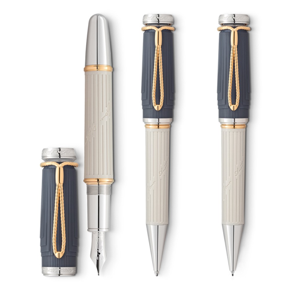Few authors in literary history have had the ability to craft dialogue and bring characters to life as elegantly, ironically and astutely as British author Jane Austen. Montblanc has created the Writers Edition Homage to Jane Austen to celebrate one of English literature’s most famous authors. This edition brings to life the Regency era, when noble country estates were the scene of great parties held for the purpose of cultivating social relationships and forging marriage alliances. The fluting of a classical column embellishes the elegant sandstone-grey resin barrel, along with Jane Austen’s signature. The contrasting grey-blue cap references the type of double-collared Regency coat typically worn by gentlemen such as Mr Darcy in Pride and Prejudice. Gold-coated rings on the barrel and platinum-plated fittings add finishing touches to the design. The engraving of the Roman numerals XLIII on the cap ring are a reference to the chapter of the novel in which Elizabeth Bennet sees Mr Darcy’s estate for the first time. The title page of her novel Sense and Sensibility, published in 1811, merely declared the work to have been written ‘By a Lady’. This statement of authorship adorns the cap top of the Writers Edition Homage to Jane Austen Limited Edition, along with the Montblanc emblem. The silhouette of the writing instrument itself resembles a wax seal stamp. The clip is every bit as unusual as the cap. Shaped like a braided cord with a drawstring closure, it resembles that of a ‘reticule’, a type of bag used by women around 1800 to carry their powder, mirror and the indispensable pocket handkerchief. The only known silhouette of Jane Austen, which shows her delicate features, is immortalized as an artistic engraving on the handcrafted, rhodium-coated solid Au 750 gold nib.
