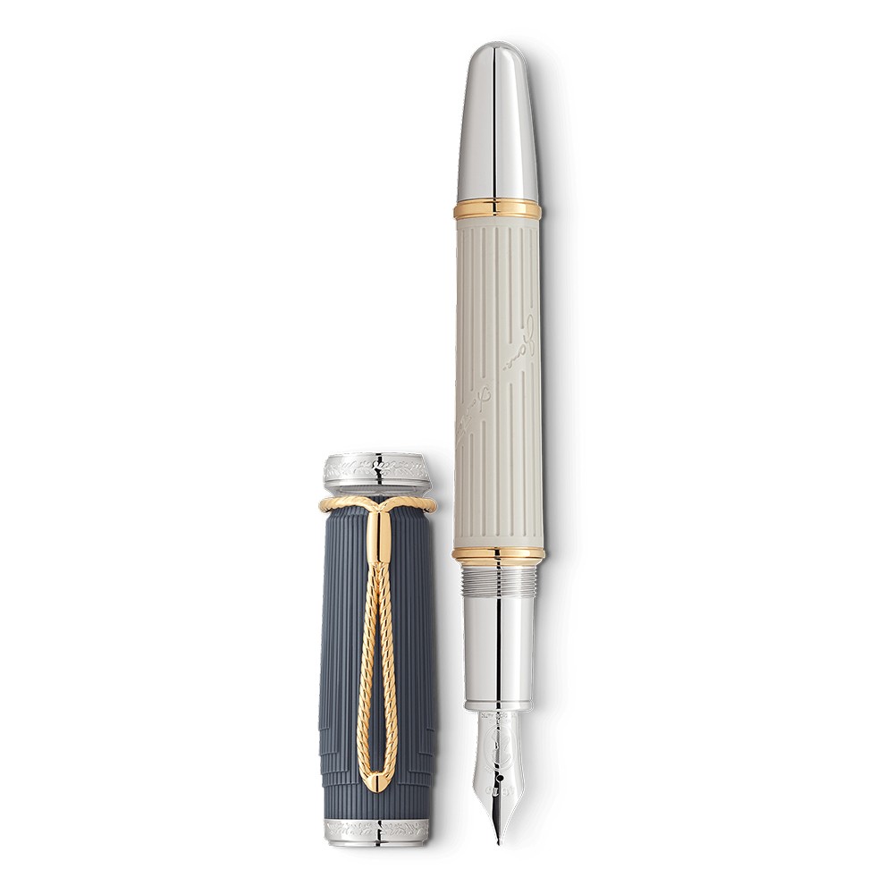 Few authors in literary history have had the ability to craft dialogue and bring characters to life as elegantly, ironically and astutely as British author Jane Austen. Montblanc has created the Writers Edition Homage to Jane Austen to celebrate one of English literature’s most famous authors. This edition brings to life the Regency era, when noble country estates were the scene of great parties held for the purpose of cultivating social relationships and forging marriage alliances. The fluting of a classical column embellishes the elegant sandstone-grey resin barrel, along with Jane Austen’s signature. The contrasting grey-blue cap references the type of double-collared Regency coat typically worn by gentlemen such as Mr Darcy in Pride and Prejudice. Gold-coated rings on the barrel and platinum-plated fittings add finishing touches to the design. The engraving of the Roman numerals XLIII on the cap ring are a reference to the chapter of the novel in which Elizabeth Bennet sees Mr Darcy’s estate for the first time. The title page of her novel Sense and Sensibility, published in 1811, merely declared the work to have been written ‘By a Lady’. This statement of authorship adorns the cap top of the Writers Edition Homage to Jane Austen Limited Edition, along with the Montblanc emblem. The silhouette of the writing instrument itself resembles a wax seal stamp. The clip is every bit as unusual as the cap. Shaped like a braided cord with a drawstring closure, it resembles that of a ‘reticule’, a type of bag used by women around 1800 to carry their powder, mirror and the indispensable pocket handkerchief. The only known silhouette of Jane Austen, which shows her delicate features, is immortalized as an artistic engraving on the handcrafted, rhodium-coated solid Au 750 gold nib.