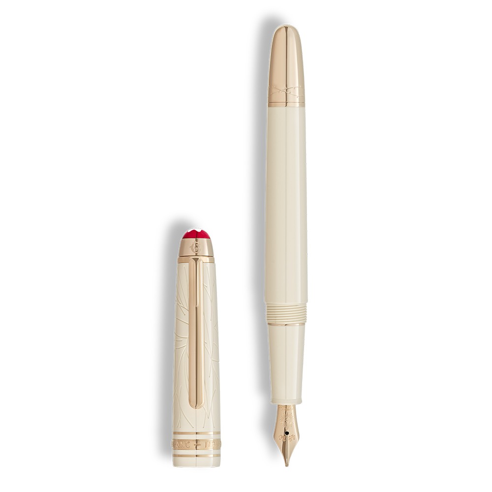 | Cap | Ivory-colored precious resin cap with feather pattern, with the Montblanc emblem on the cap top embedded in precious coral-colored resin. |