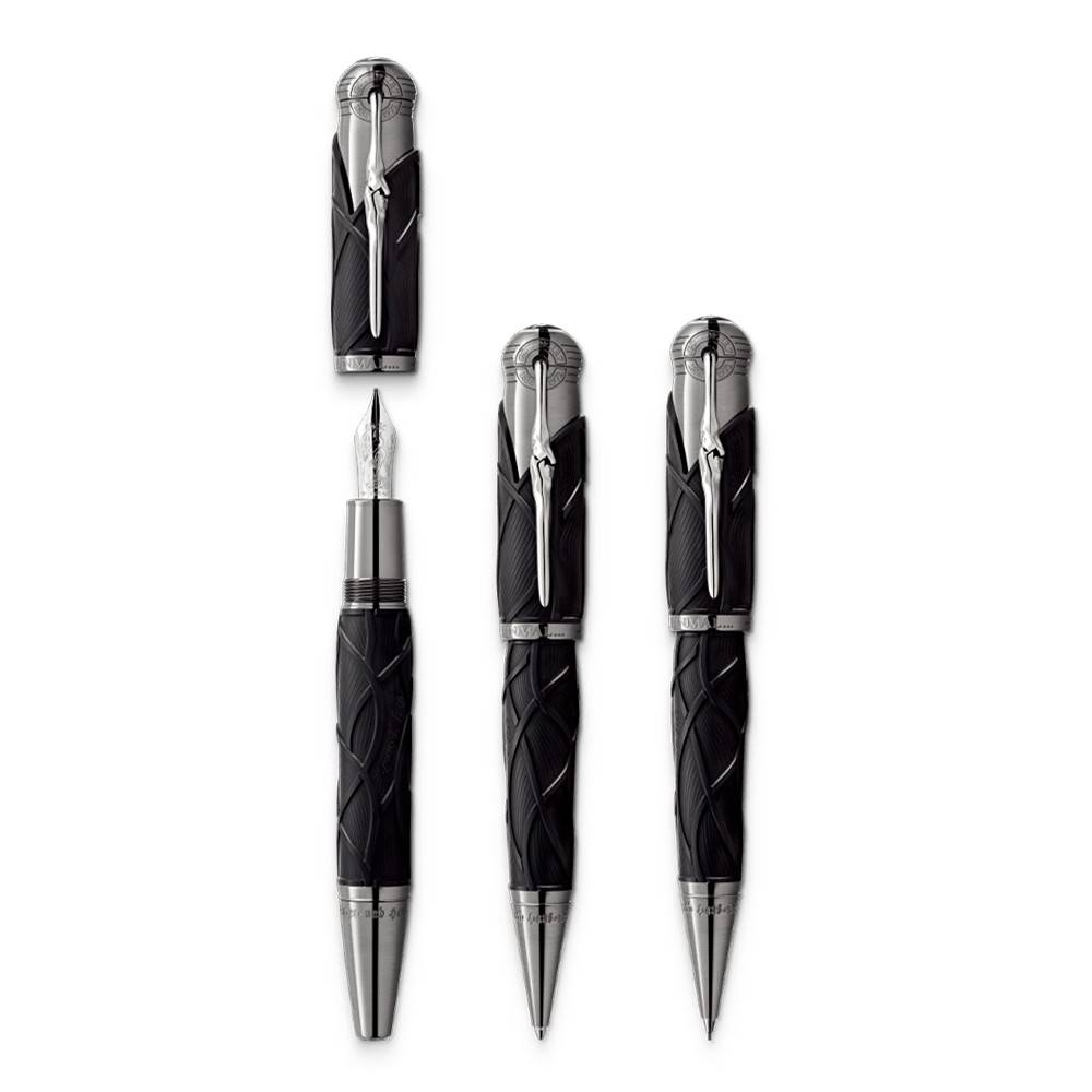 Once upon a time... The Montblanc Writers Edition Homage to the Brothers Grimm is dedicated to Jacob and Wilhelm Grimm and celebrates their work on German and European folktales, among which are some of the most famous fairy tales such as Snow White , Cinderella and Sleeping Beauty . The overall silhouette of the writing instrument is shaped like an old hiking stick, while the black color resembles the darkness of the woods which usually serve as the main stage for the Brothers Grimm’s folklore. In addition, the wave-like pattern on the cap and barrel is inspired by Rapunzel’s hair while also resembling roots, since the Brothers Grimm viewed their linguistic work as research into roots . The cap is crowned by the Montblanc Emblem in precious resin. The platinum-coated clip, reminiscent of a knobby piece of wood, surprisingly reveals the silhouette of the profile of the Brothers Grimm when turned.