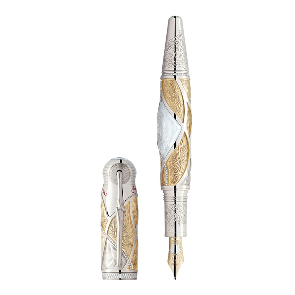 "Once upon a time..." The Montblanc Writers Edition Homage to the Brothers Grimm is dedicated to Jacob and Wilhelm Grimm and celebrates their work on German and European folktales, among which are some of the most famous fairy tales such as "Snow White", "Cinderella" and "Sleeping Beauty". This writing instrument is made from 18K solid white gold and, as an homage to the tale of "Snow White", features hand-engraved yellow gold-coated leaves as well as several 18K solid white gold inlays resembling ore which the dwarves of the tale would dig up from deep in the mountains. As a highlight, the barrel features a hand-cut rock crystal "tomb" underneath which Snow White peacefully sleeps. The cap is crowned by the Montblanc Emblem in precious 18K solid white gold delicately resembling the letters "A" to "F" under sapphire glass. The 18K solid white gold cone with engravings is adorned by seven rubies as an homage to the dwarves. The 18K solid white gold clip, also inspired by a knobby piece of wood, surprisingly reveals the silhouette of the profile of the Brothers Grimm when turned. As an homage to Snow White, the handcrafted 18K solid gold nib bears an apple.
