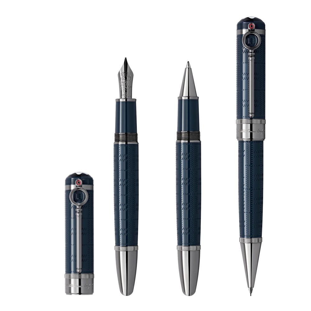 The Montblanc Writers Edition Sir Arthur Conan Doyle Limited Edition is dedicated to one of the most renowned crime novelists and creator of the famous consulting detective Sherlock Holmes. Made from blue-gray precious resin, the edition evokes the sinister, foggy atmosphere of London, where Sherlock Holmes usually solves his cases. The cap and barrel of this edition are decorated with a plaid pattern in reference to Holmes' coat, as well as parts of a historic London city map. The initials JB are found beneath the PVD-coated, magnifying glass-shaped clip in tribute to Joseph Bell: the very real man behind the Sherlock Holmes character. The Montblanc emblem in precious resin crowns the cap of the edition.