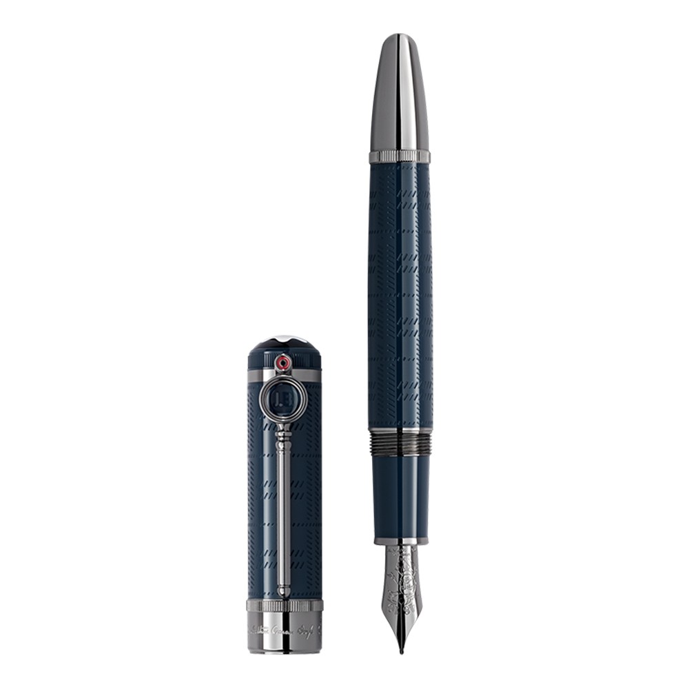 The Montblanc Writers Edition Sir Arthur Conan Doyle Limited Edition is dedicated to one of the most renowned crime novelists and creator of the famous consulting detective Sherlock Holmes. Made from blue-gray precious resin, the edition evokes the sinister, foggy atmosphere of London, where Sherlock Holmes usually solves his cases. The cap and barrel of this edition are decorated with a plaid pattern in reference to Holmes' coat, as well as parts of a historic London city map. The initials JB are found beneath the PVD-coated, magnifying glass-shaped clip in tribute to Joseph Bell: the very real man behind the Sherlock Holmes character. The Montblanc emblem in precious resin crowns the cap of the edition. The handcrafted 18K solid gold nib is engraved depicting flying dinosaurs from The Lost World around the portrait of the father of Professor Challenger and Sherlock Holmes.
