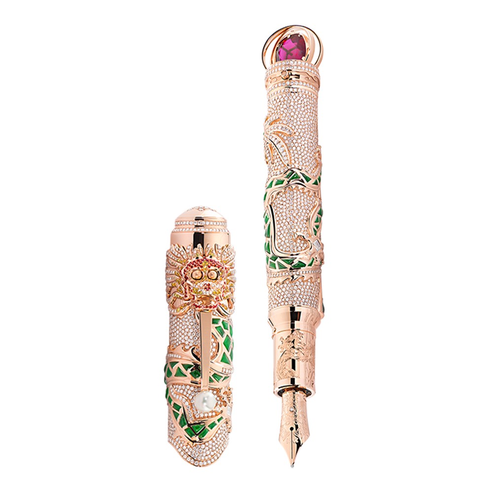 | Overall Design | The overall design with its dragon motif is inspired by Kangxi‘s portrait. Cap and barrel are made of Au750 solid rose-tone gold, fully set with diamonds (~10,81 ct.) in pavé and enriched with a dragon set with individual cut green jade (~8,18 ct.) and one line of brilliant cut diamonds. | |