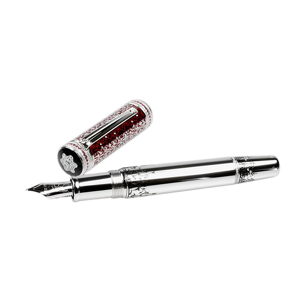 | Cap | The cap rings are set with 60 rubies (~0,504 ct.). The red lacquer inlays on the cap create a stunning contrast to the solid white gold arabesque pattern. |