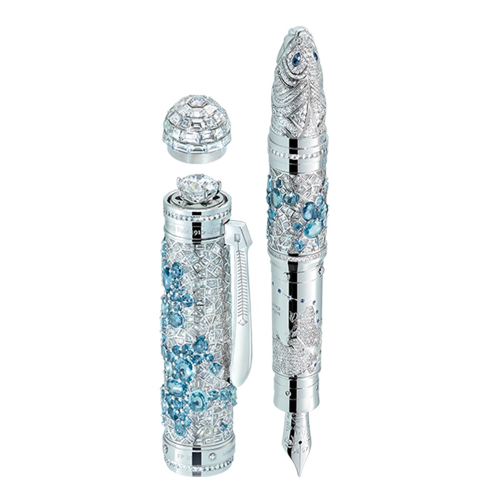| Cap | Cap and barrel features a multilevel stone setting to simulate the icy waters. Fully set with diamonds with sapphires and Paraiba tourmaline. |