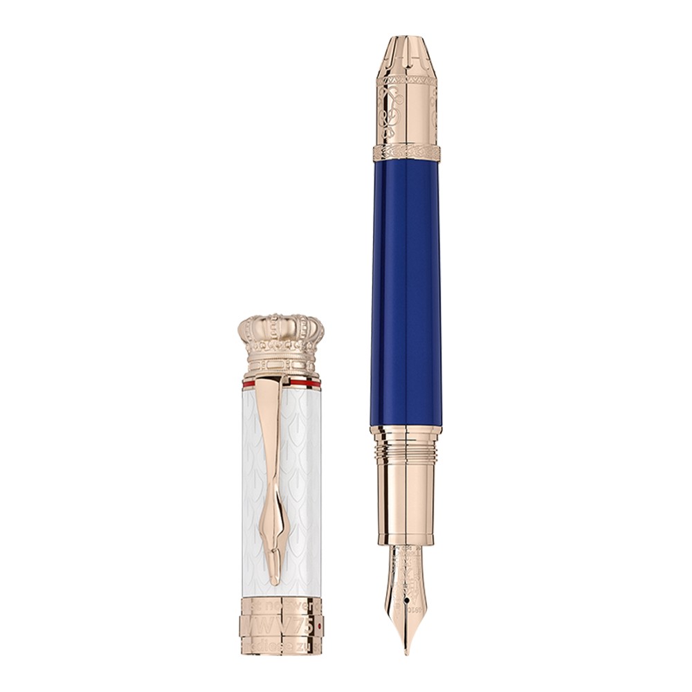 The creation is made of blue precious lacquer inspired by the Bavarian flag. The white precious lacquer with guilloché engraving is inspired by swan feathers. The cap ring is set with a Cubic Zirkonia red and engraved with 'WWV75' - the reference code of the opera Lohengrin. The signature gold coated crown on the cap top symbolizes a detail of the monarch's royal seal. The emblem is made of precious resin. The shape of the clip reminds of his nickname 'Swan King'. The shape of the cone is inspired by the towers adorning Schloss Neuschwanstein’s front door. The engraving on the cone is inspired by the seal of Ludwig II. The Au750 solid gold nib is enriched with a fine engraving of Schloss Neuschwanstein.