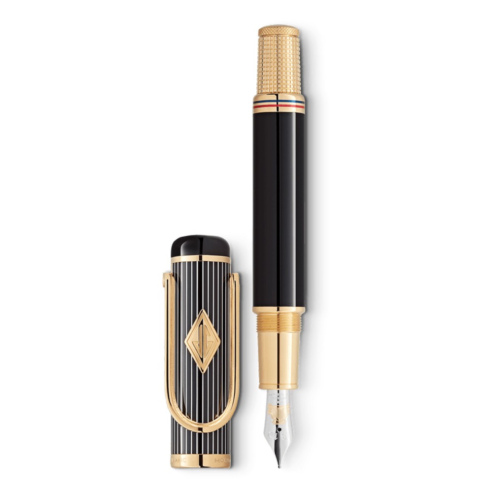 Certain novels go down in literary history and, at the same time, come to symbolize an entire epoch. F. Scott Fitzgerald’s ‘The Great Gatsby’ is one such gem of modern American literature. Published in 1925, the novel paints a fascinating picture of the Jazz Age and the Roaring Twenties, a time of unprecedented affluence and self-indulgence. Pulsating New York City, the opulent mansions of Long Island and the dazzling high society parties are the backdrop to the story of Jay Gatsby, a mysterious millionaire, who will stop at nothing to regain the affections of the lost love of his youth, Daisy Buchanan. The chosen style of the era’s elite became a fashion classic for successful businessmen – and the inspiration behind this writing instrument. The pinstriped design of the cap made of precious black and white lacquer harmonizes with the barrel finished in precious black lacquer. The apparent power of money is symbolized in the edition by the platinum-coated clip which takes the form of a money clip. Its rounded opening is resplendent with the initials of Jay Gatsby as a rhomboidal gold colored Art Deco monogram. The myth of the American dream and the design of the often stylish hip flasks of the Art Deco period are referenced by the cone which imitates the engraved screw cap of a flask and the fine rings in the colors of the American flag encircling it. The crowning Montblanc emblem is made of mother-of-pearl, a material whose iridescent colors and shimmering glow inspired some of the most elegant creations by jewelry designers of the Art Deco period. The essence of the American dream fulfilled is disclosed when removing the cap and glimpsing the handcrafted, bi-color solid Au 750 rhodium-coated gold nib. This is decorated with an image of Jay Gatsby’s sumptuous car, enthusiastically described by F. Scott Fitzgerald as being of ‘a rich cream color, bright with nickel, ... and terraced with a labyrinth of wind-shields that mirrored a dozen suns.’