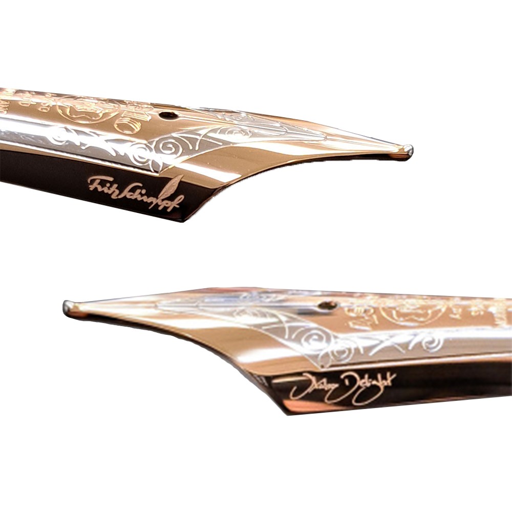 The German retailer Frtiz Schimpf have previously released a very small number of special collaborations with Montblanc and this 'Italic Delight' celebrates the retailers 145th anniversary. The star of the show is the wonderful italic nib, with a vertical line width of approx. 0.65mm and a horizontal width of 0.25mm. In terms of stroke width it's a medium. It's also possible to use the nib upside down, which creates a stroke width of 0.22mm. The left nib shoulder is engraved with 'Italic Delight', with the right being engraved with 'Fritz Schimpf'. The pen is crafted from black resin, with the trim being red gold-coated.