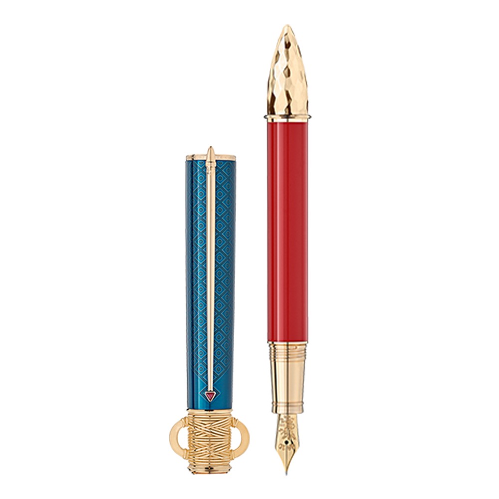 Moctezuma I was crowned ruler of the great Aztec Empire in 1440, thereby ushering in the golden age of the Aztecs. During his reign, he shaped the image of the Aztec state that we are familiar with today – a state rich in culture and mythology. The capital city Tenochtitlán, today’s Mexico City, blossomed under his rule. The Montblanc Patron of Art Homage to Moctezuma I Limited Edition 4810 with signature gold-coated fittings is dedicated to this supreme ruler of one of the most special cultures in world history. The overall design is inspired by an atlatl, an Aztec spear-throwing device. The shape of the cone, refined with a hammer finish, is based on an Aztec sacrificial knife with an obsidian blade. The lacquer colors - petrol and carmine red - are inspired by the colors of the royal cloak. The two hieroglyphs decorating the cap symbolize the years of Moctezuma I's reign. The handcrafted Au 750 solid gold nib is adorned with a fine engraving inspired of the Aztec glyph for the city of Tenochtitlán: a three-armed cactus with a royal diadem and two scrolls.