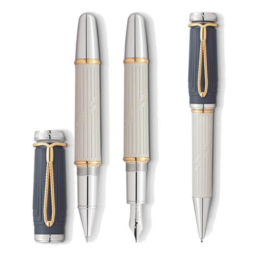 Few authors in literary history have had the ability to craft dialogue and bring characters to life as elegantly, ironically and astutely as British author Jane Austen. Montblanc has created the Writers Edition Homage to Jane Austen to celebrate one of English literature’s most famous authors. This edition brings to life the Regency era, when noble country estates were the scene of great parties held for the purpose of cultivating social relationships and forging marriage alliances. The fluting of a classical column embellishes the elegant sandstone-grey resin barrel, along with Jane Austen’s signature. The contrasting grey-blue cap references the type of double-collared Regency coat typically worn by gentlemen such as Mr Darcy in Pride and Prejudice. Gold-coated rings on the barrel and platinum-plated fittings add finishing touches to the design. The engraving of the Roman numerals XLIII on the cap ring are a reference to the chapter of the novel in which Elizabeth Bennet sees Mr Darcy’s estate for the first time. The title page of her novel Sense and Sensibility, published in 1811, merely declared the work to have been written ‘By a Lady’. This statement of authorship adorns the cap top of the Writers Edition Homage to Jane Austen Limited Edition, along with the Montblanc emblem. The silhouette of the writing instrument itself resembles a wax seal stamp. The clip is every bit as unusual as the cap. Shaped like a braided cord with a drawstring closure, it resembles that of a ‘reticule’, a type of bag used by women around 1800 to carry their powder, mirror and the indispensable pocket handkerchief. The only known silhouette of Jane Austen, which shows her delicate features, is immortalized as an artistic engraving on the handcrafted, rhodium-coated solid Au 750 gold nib.